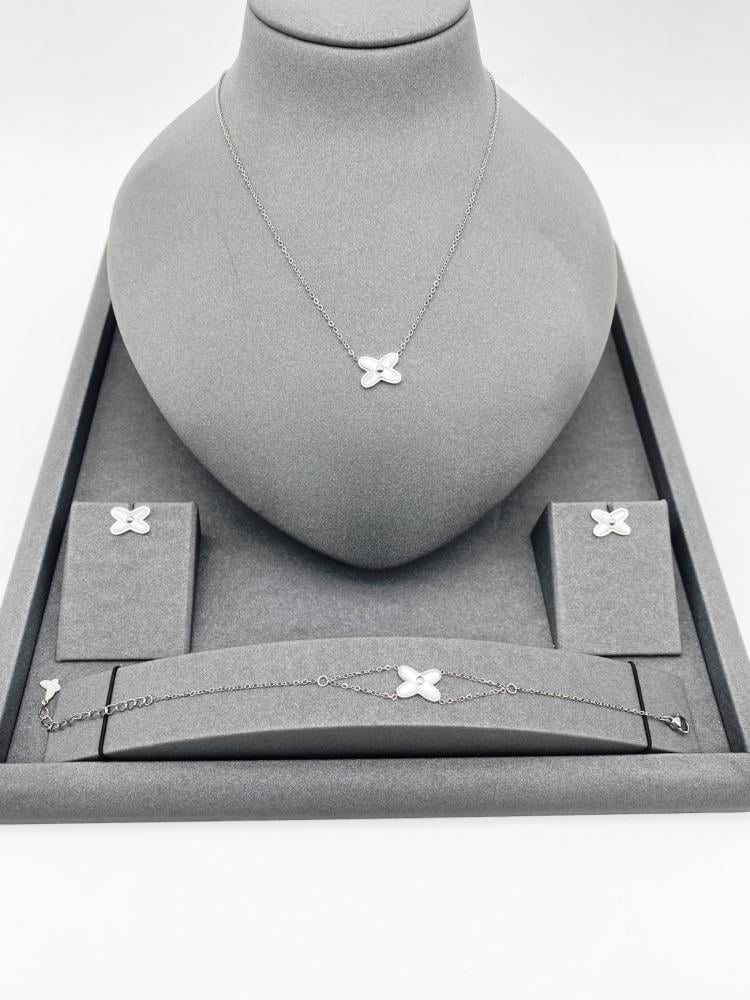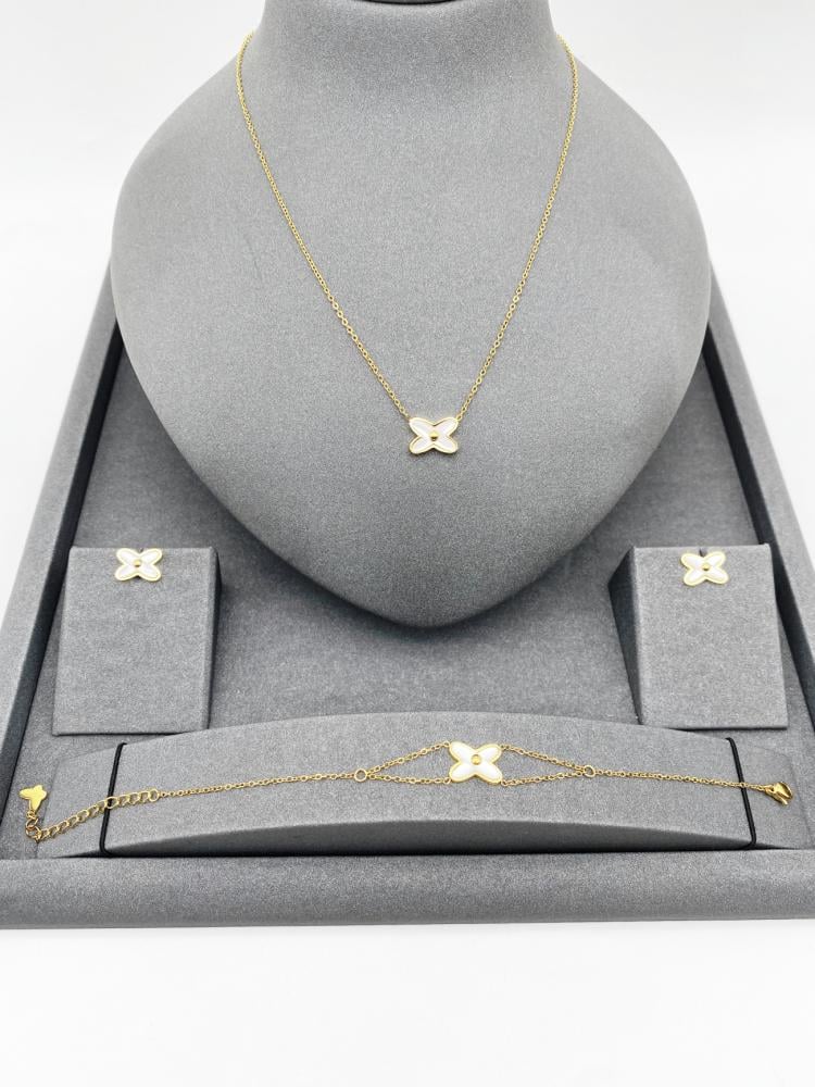 أضيفي لمسة من الأناقة إلى إطلالتك مع هذا الطقم المكونة من 3 قطع السلسال، الحلق، السوارة. مصنوعة من الفولاذ المقاوم للصدأ بجودة عالية، مما يضمن لك إطلالة تدوم طويلاً دون القلق من التآكل أو الصدأ. تجمع هذه المجموعة بين البساطة والجاذبية، لتمنحك لمسة من الفخامة والتميز. إنها المجموعة المثالية التي تناسب جميع المناسبات وتعكس أسلوبك الفريد، سواء كنتِ تبحثين عن لمسة عصرية أو كلاسيكية.