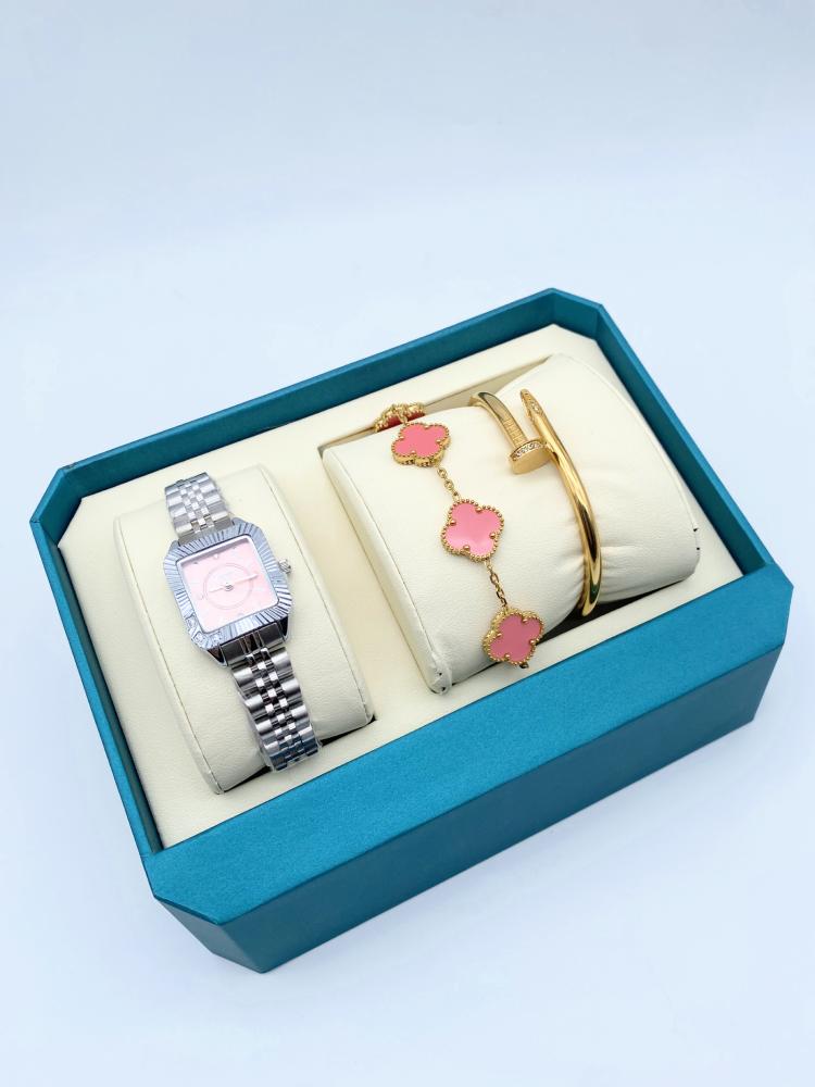 • ساعة فاخرة: بتصميم عصري وراقي يجمع بين العملية والجمال لتكمل إطلالتك بأسلوب أنيق.
